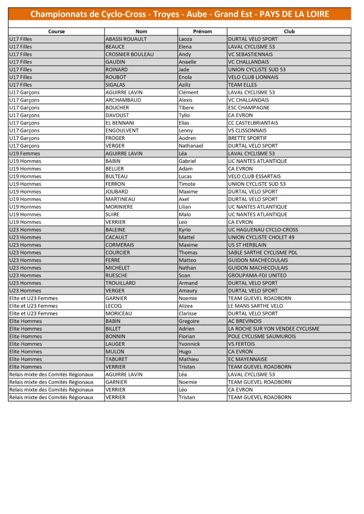 Vous trouverez ci-dessous la sélection pour les Championnats de France de Cyclo-Cross 2026 qui se dérouleront à Troyes (10) les 10 et 11 janvier 2026.