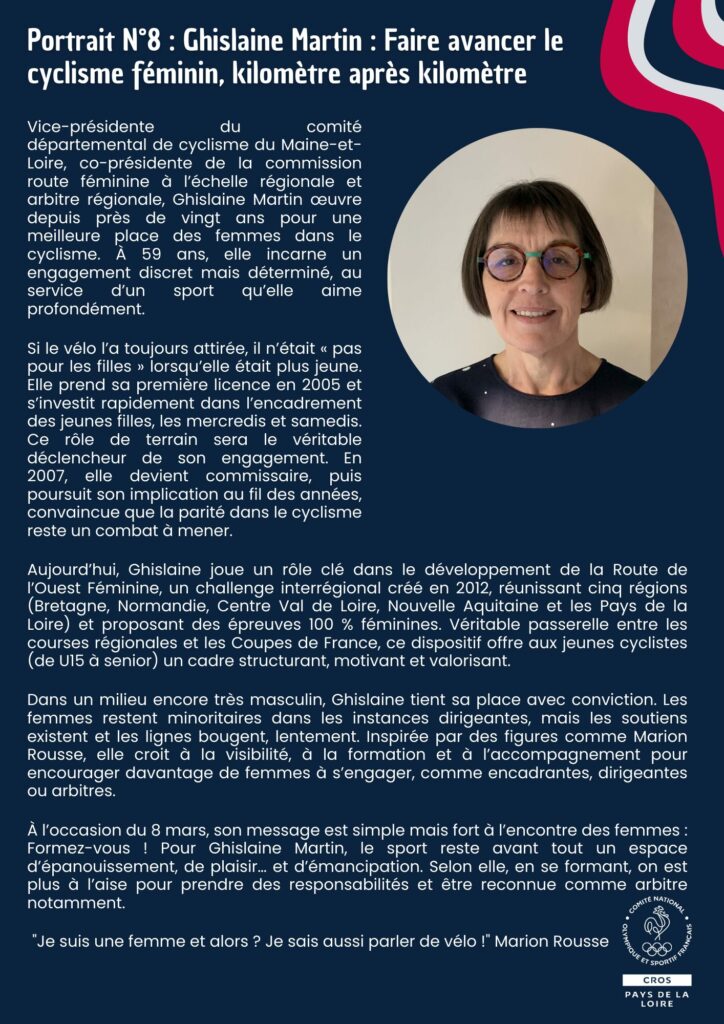 Découvrez le portrait inspirant de Gislaine Martin, une figure clé du cyclisme féminin, dans la newsletter du CROS Pays de la Loire. Son dévouement et sa passion font avancer le sport !