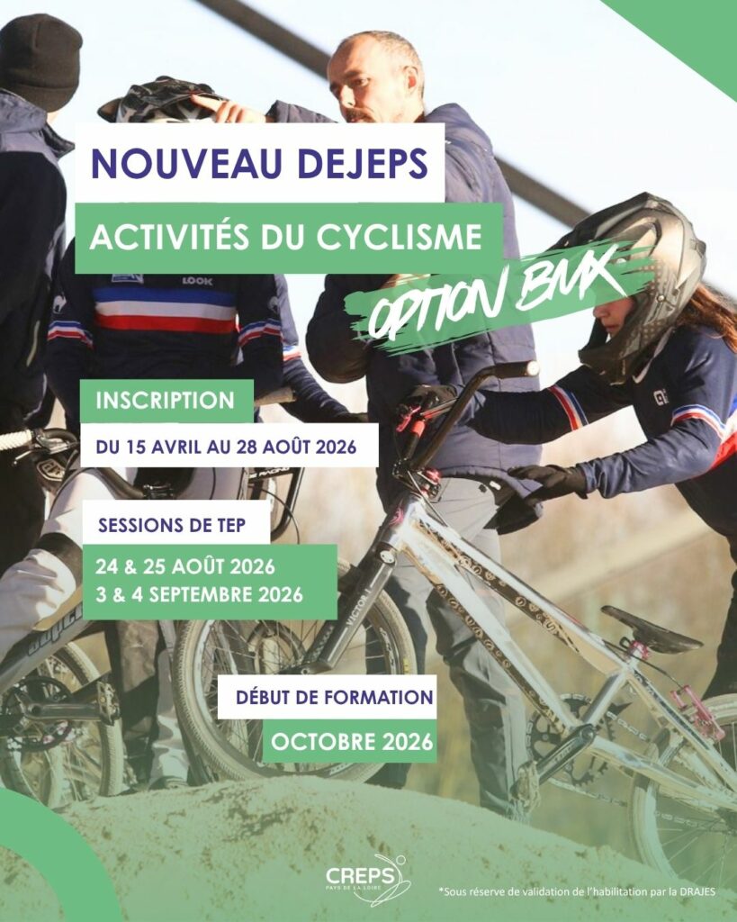 Le CREPS des Pays de la Loire propose désormais le DEJEPS – Activités du Cyclisme, option BMX. Cette formation est conçue pour former des professionnels aptes à élaborer et diriger des projets de perfectionnement sportif en BMX, à encadrer les pratiquants et à contribuer au développement de cette discipline au sein des structures fédérales.